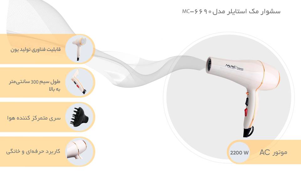 سشوار حرفه ای مک استایلر مدل 6690 به وسیله برند مک در این جهت ساماندهی شده است و مطابق با استانداردهای جهانی و ماشین آلات مدرن، به مرحله ساخت رسیده است. سشوار مک استایلر مدل MC-6690 از یک برند شناخته شده است. ضمانت نامه 2 ساله در کنار این مدل، به مصرف کننده داده میشود که خیال فرد از خرید بیشتر و اشتیاق او افزون میشود. طراحی سشوار مک استایلر مدل 6690 استاندارهای جهانی و روشهای مدرن برای یک طراحی موفق، مورد استفاده قرار گرفتهاند. سشوار حرفهای مک استایلر مدل 6690 ، شکل و ظاهری مخصوص به خود دارد. از نظر ساختار بدنهای ارگونومی دارد که اندازه و شکل دسته آن برای در دست گرفتن مناسب است. استفاده دستی از این دستگاه باعث رعایت این نکته شده است. اگر بیش از حد سنگین باشد و یا بزرگ، دست را اذیت میکند. این محصول برای شما خسته کننده نخواهد بود. برای ساخت بدنه از ABS (پلاستیک فشرده) استفاده شده است. این متریال باعث مقاوم کردن دستگاه شده و در برابر ضربات آن را حفظ میکند. این محصول یک دکمه کول شات هم دارد. کار این گزینه خنک و سرد کردن یکباره هوا است.